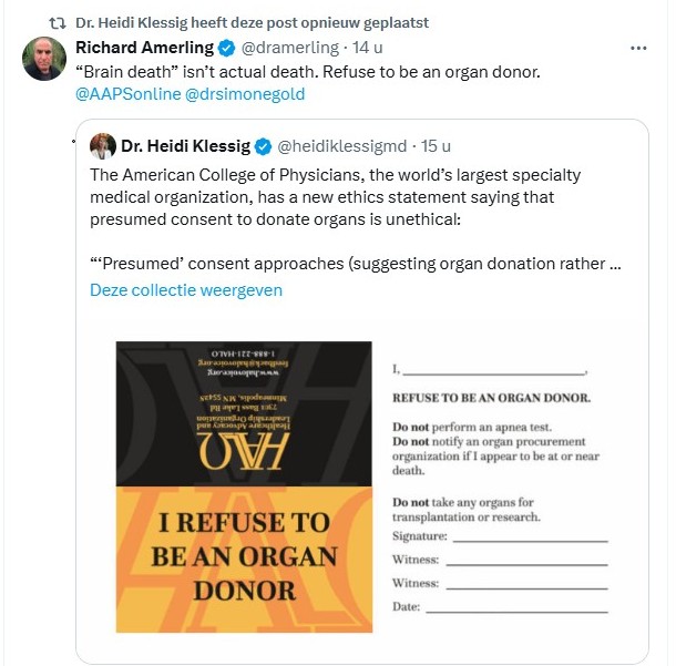 MD nefroloog Dr. Amerling, voormalig voorzitter van de Association of American Physicians and Surgeons, in Kissimmee, Florida. In 2022 reageerde hij nog fel op de ongeoorloofde orgaanverwijdering in China en zei “”In feite executeren ze een levend persoon door zijn hart te verwijderen. Technisch gezien leven ze nog steeds, ze zijn niet hersendood. Het is absoluut afschuwelijk.” Anno 2025 zegt hij openlijk op X dat hersendood niet inhoudt dat je dood bent en adviseert mensen om geen orgaandonor te worden.